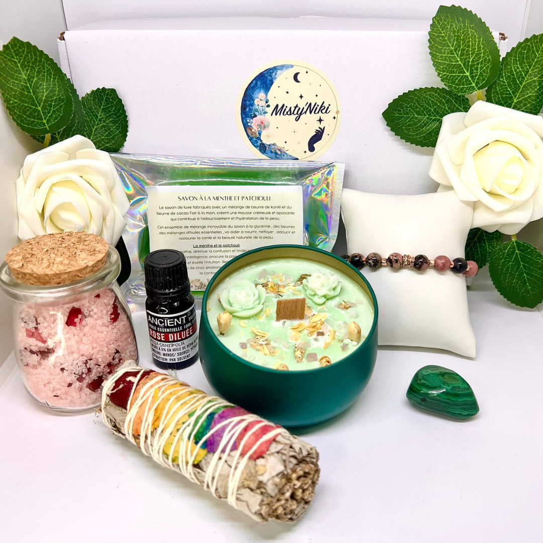 Bougie jasmin, bracelet rhodonite, sauge blanche avec des pétales de rose, savon (menthe et patchouli) ou Sel de bain (benjoin, orange et gingembre), huile essentielle de rose, pierre roulée Malachite.