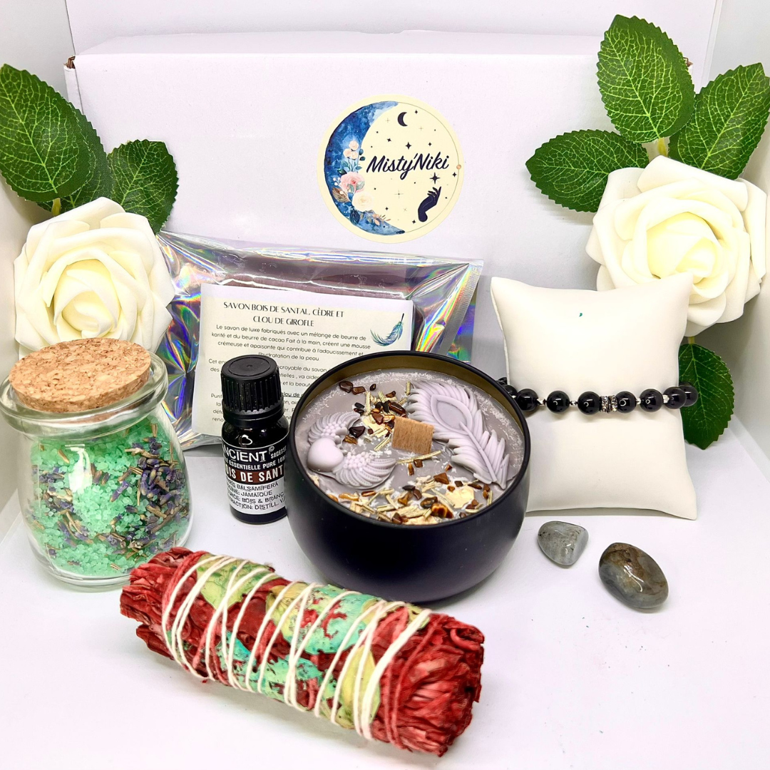 Bougie senteur des bois, bracelet spinelle noire, sauge sang du dragon, savon (bois de santal, cèdre et clou de girofle) ou Sel de bain (géranium, lavande, bergamote), huile essentielle Bois de santal, pierre roulée Labradorite